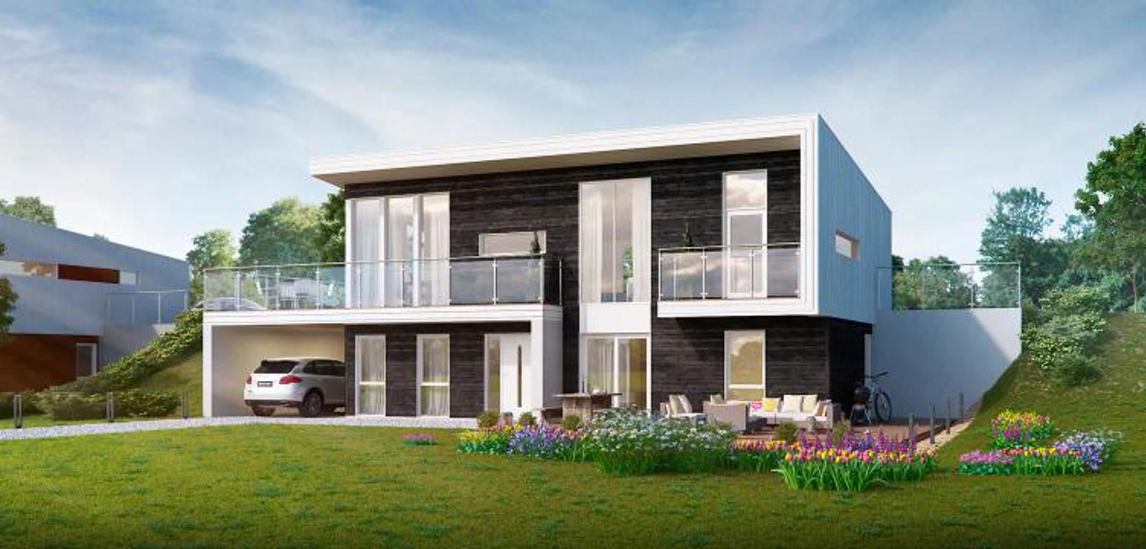 Opplev det moderne designet til denne store eneboligen med en spennende og stram fasade, preget av rene linjer og store vindusflater. To balkonger og terrassen er omgitt av glassrekkverk, som skaper en spennende kontrast til den liggende kledningen i tre.