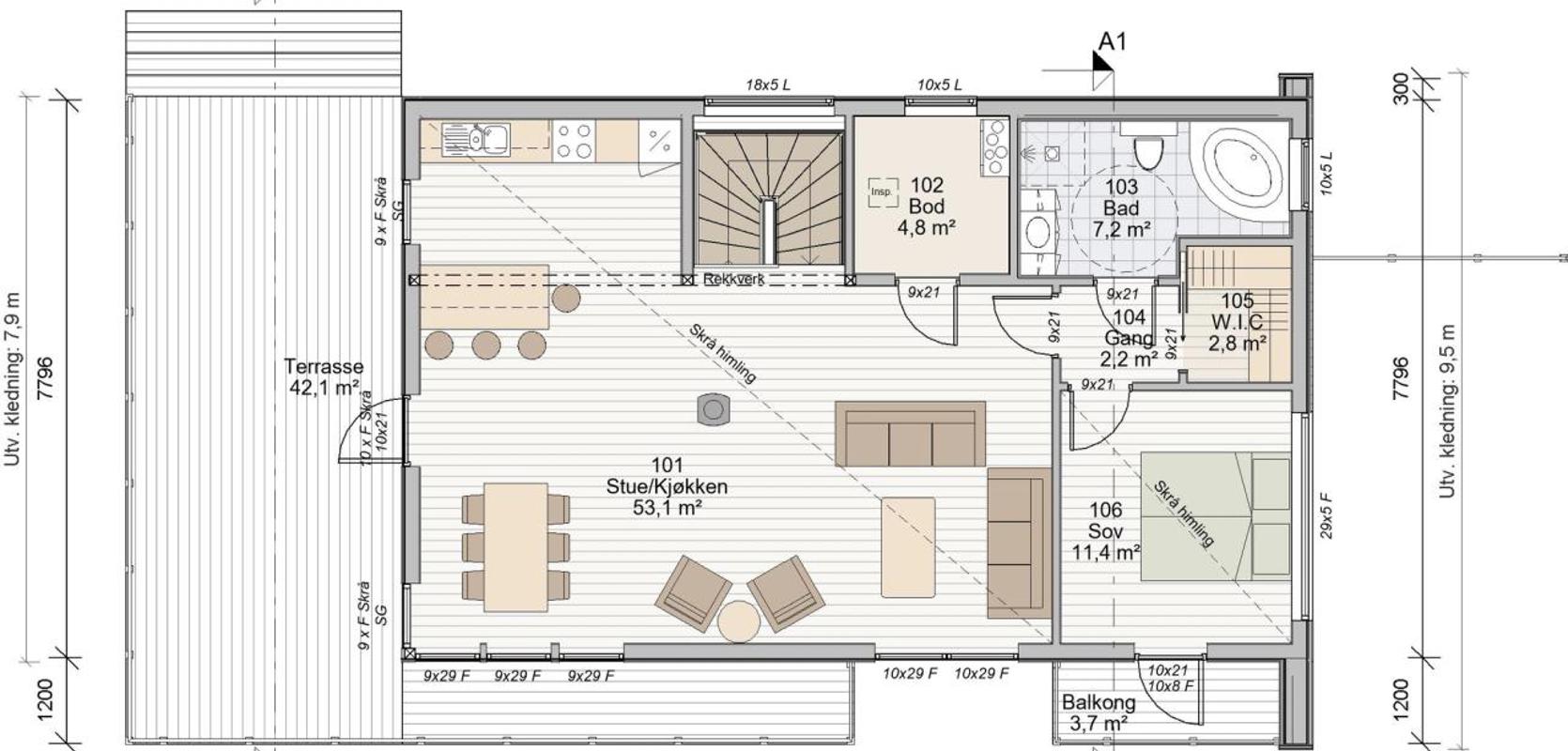 En trapp fra hallen fører deg opp til hovedplanet og inn i det romslige fellesrommet. Med skrå himling og store vindusflater gir dette rommet en flott og luftig atmosfære. Rommet er delt inn i praktiske soner, inkludert kjøkkenløsning, spiseområde og hyggesoner. Den store, flotte terrassen over carporten gir muligheten til å nyte måltider utendørs når været tillater det.