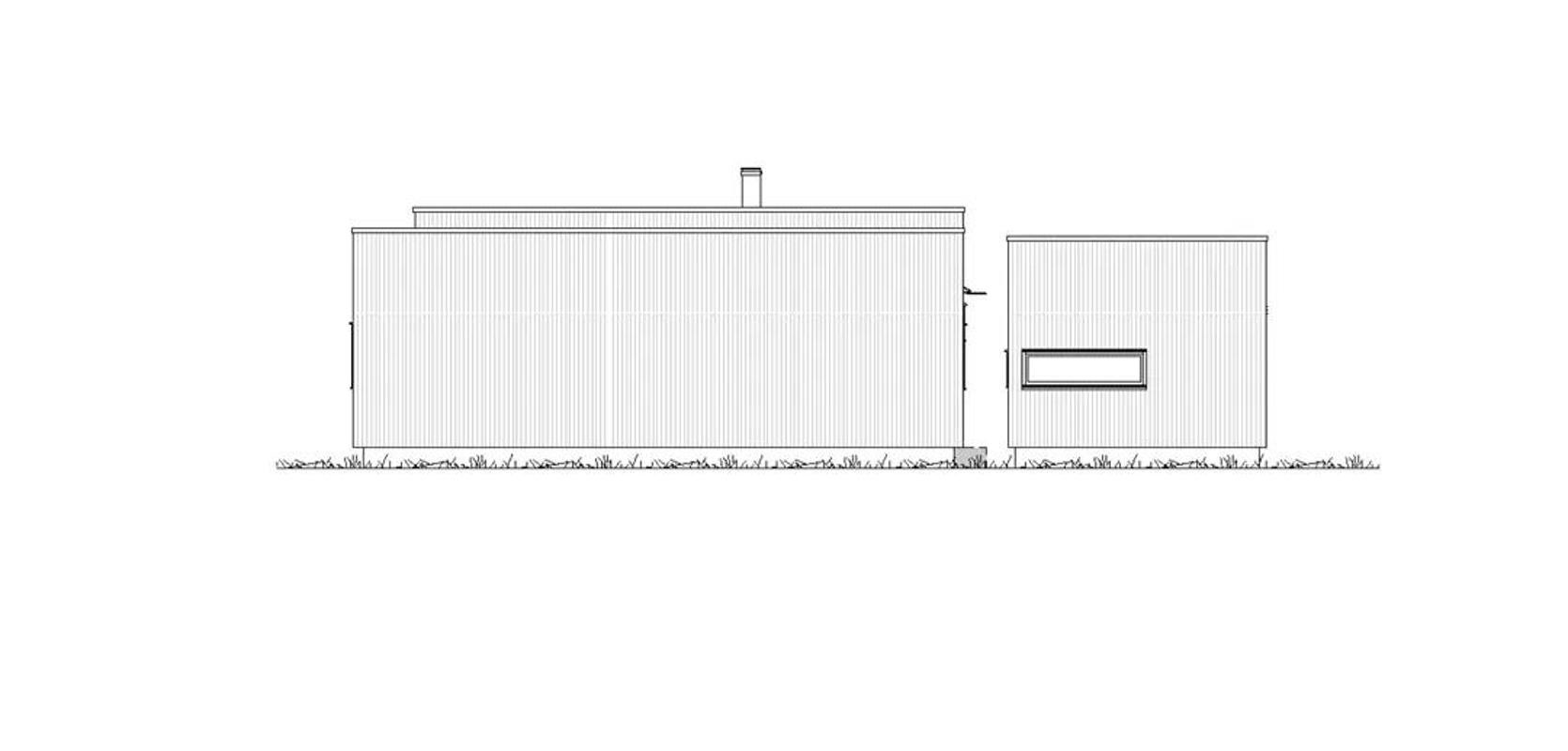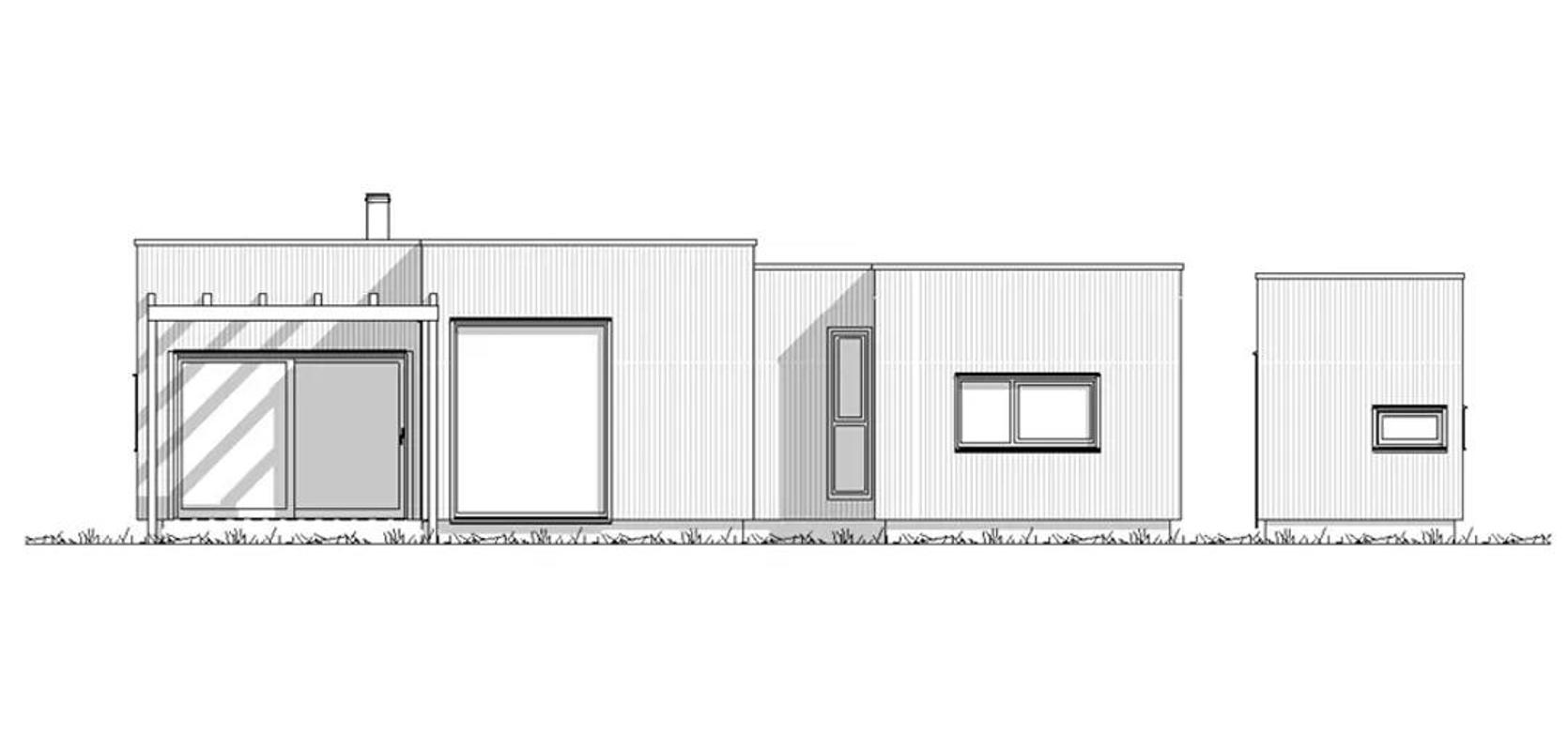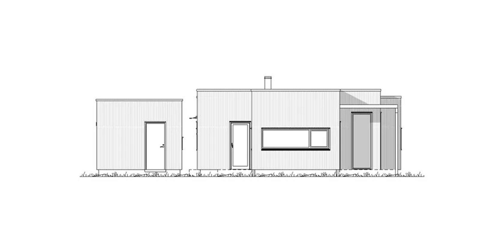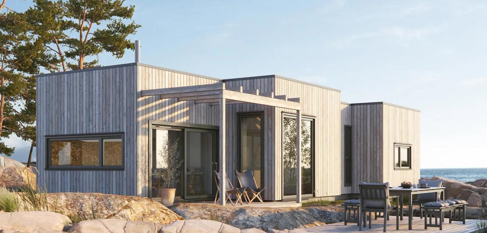 Funkishytte med store vinduer og pergola