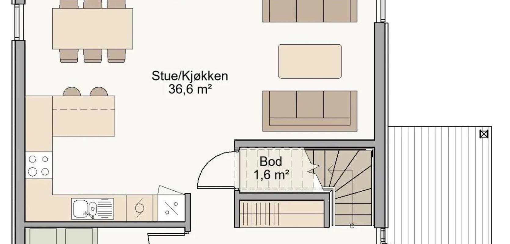 Skansen har et praktisk overbygd inngangsparti, med sportsbod rett utenfor hoveddøren. Dett gjør det lett å sette fra seg barnevogn eller andre ting som ikke trenger være med inn i huset. Rett innenfor døren er det også en bod. Videre kommer du inn til en romslig stue med utgang til terrasse. Det er plass til peis midt mellom spisestuen og stuen, slik at man kan få glede av den uansett hvor man sitter. Huset har et romslig L-formet kjøkken, med mulighet til å bygge på en bar-løsning. Etasjen har også et stort soverom og et bad.